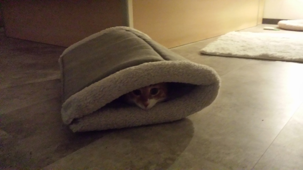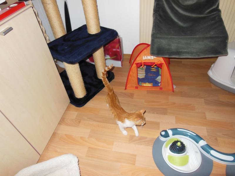 07.09.2014 - Tapsy hat die Nacht ganz brav im Büro verbracht und sich heute morgen lautstark bemerkbar gemacht als er gemerkt hat, dass ich wach bin. Zuerst gab es natürlich Frühstück für Alle und dann habe ich die Tür einfach mal aufgemacht. Loui und Gina haben - erwartungsgemäß - erst einmal gefaucht als sie Tapsy bemerkt haben. Der Kleine hatte zwar keine Angst, ging aber erst einmal wieder zurück in sein sicheres Refugium. Nach und nach hat er dann doch die ganze Wohnung erkundet und wurde dabei mit Argusaugen von Gina beobachtet. Loui hat es vorgezogen in den Garten zu entschwinden. Die Zusammenführung wird noch eine gewisse Zeit dauern aber ich bin sehr guter Dinge, dass sie sich letztendlich zusammen raufen. Und nach so vielen neuen Eindrücken muss Tapsy noch mal eine Runde schlafen.