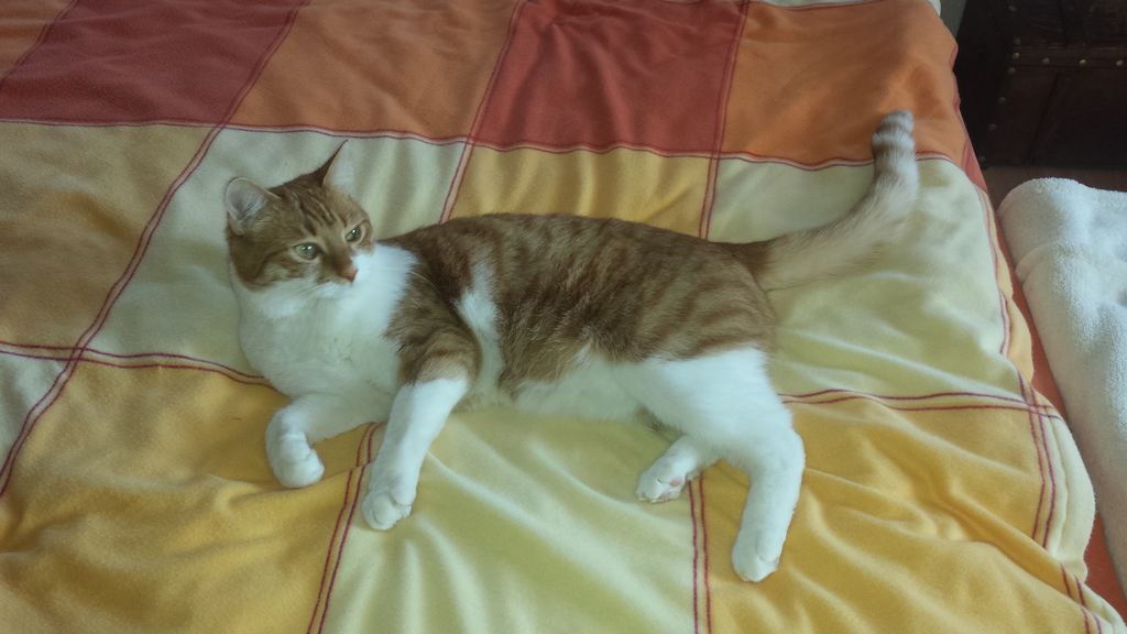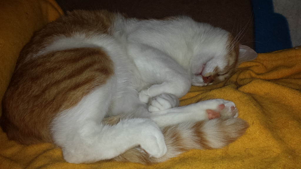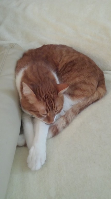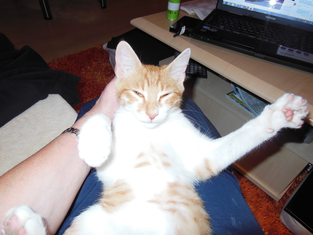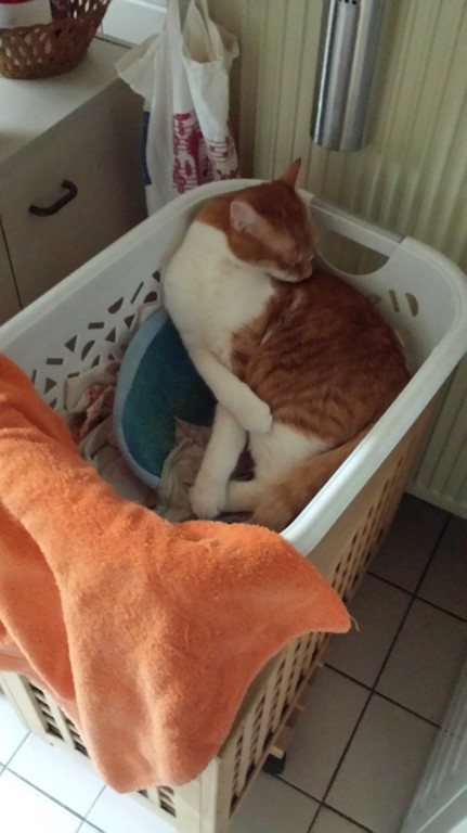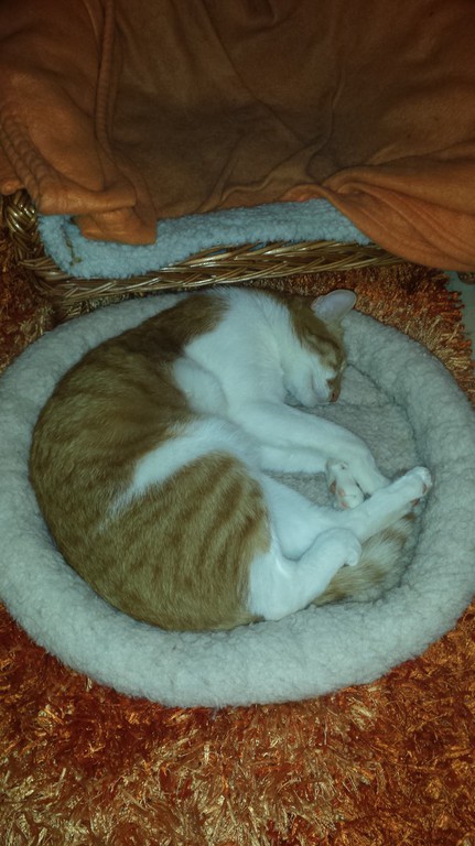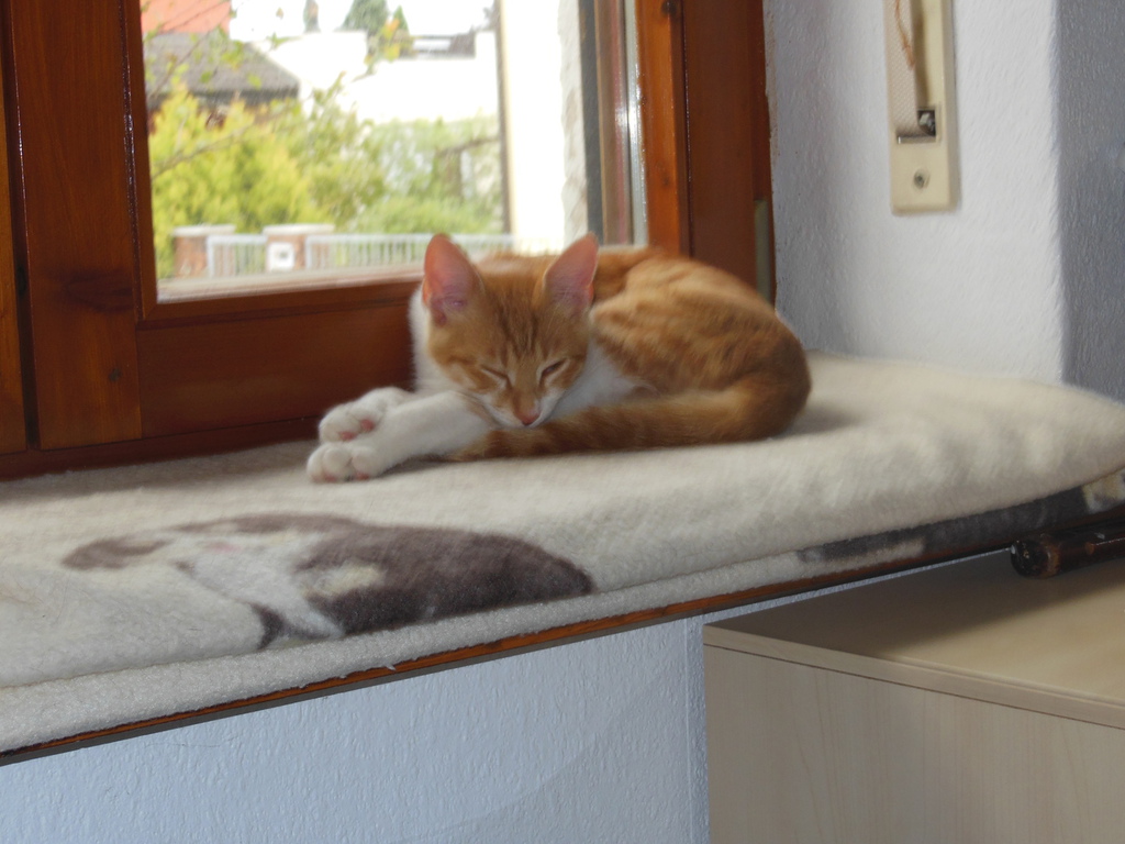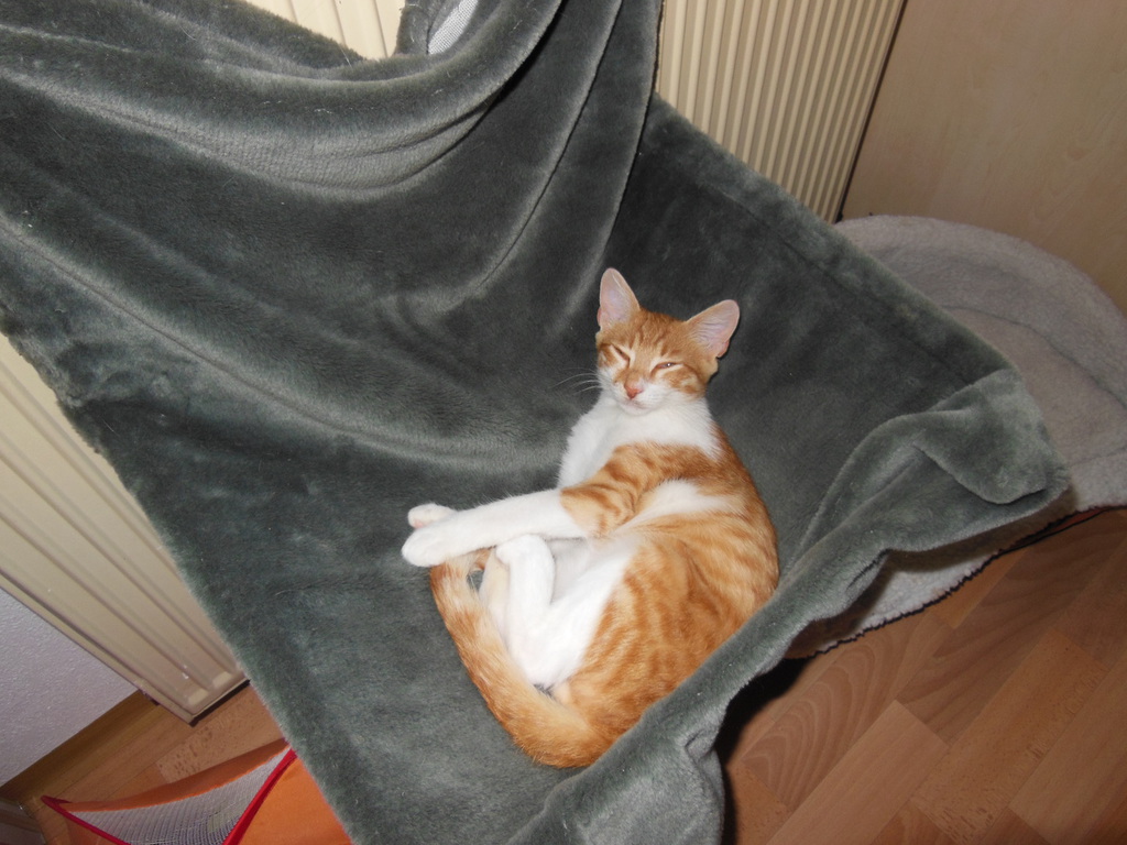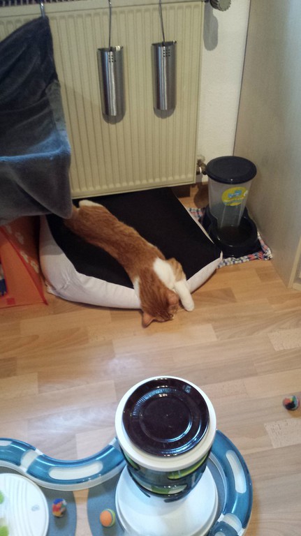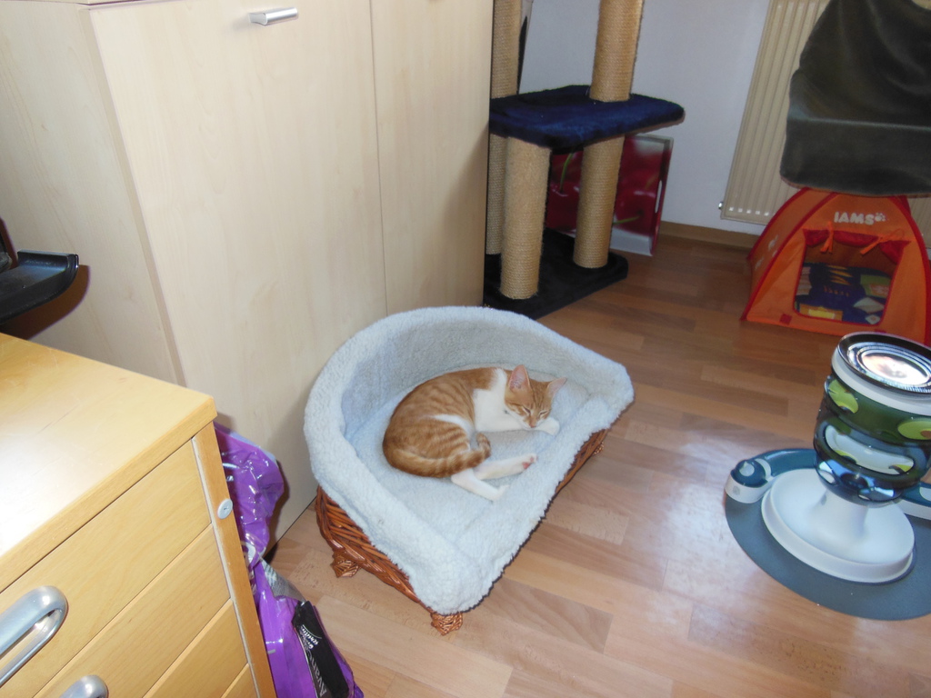 09.09.2014 - Was für ein Traumkaterchen. Er hat nach einem kurzen Besuch bei mir im Bett die ganze Nacht freiwillig in der Kuschelhalbschale des Kratzbaumes im Büro geschlafen und keinen Mucks von sich gegeben. Erst nachdem ich aufgestanden bin, hat er lautstark nach Frühstück verlangt.
