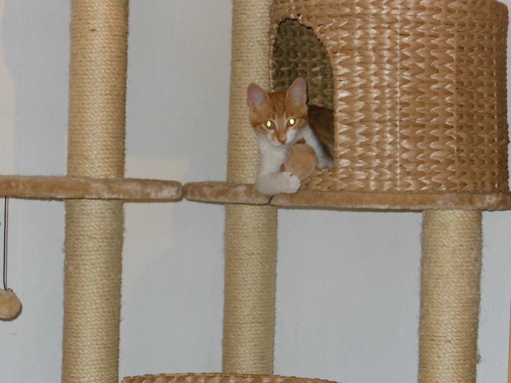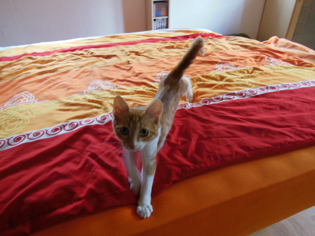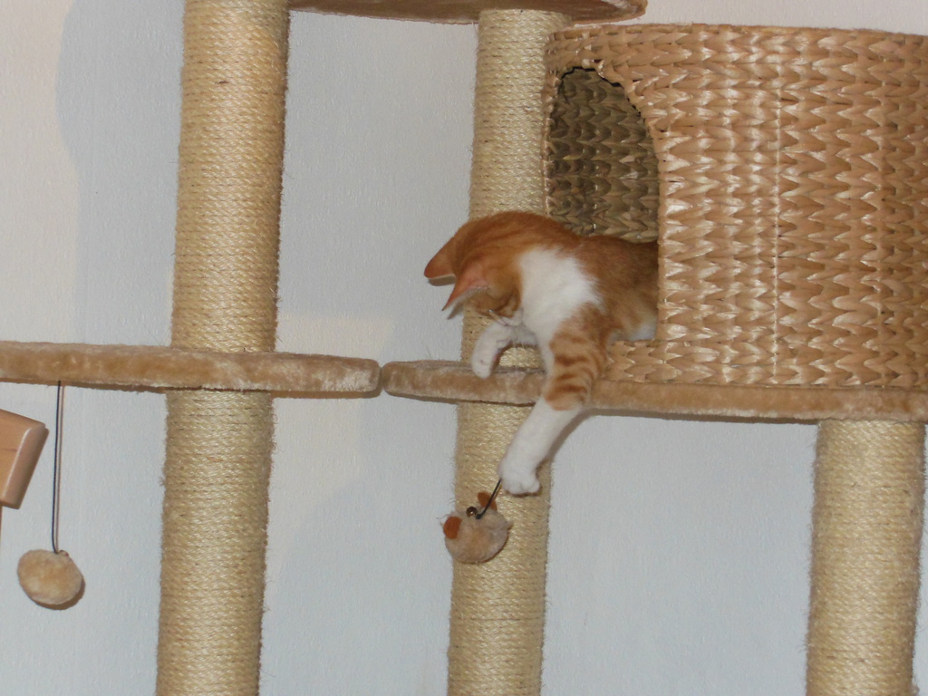 November 2014 - Tapsy ist mittlerweile ein sehr agiler Halbstarker, der jede Menge Unfug im Kopf hat. Momentan sind wir in der Phase "Alles was hängt und greifbar ist, muss runter". Also sammle ich jeden Abend Hand- und Geschirrtücher vom Boden auf und schimpfe leise vor mich hin. GsD habe ich keine Vorhänge sonst müsste ich aus den Fenstern wahrscheinlich noch einen kätzischen Trapezkünstler herauspflücken.