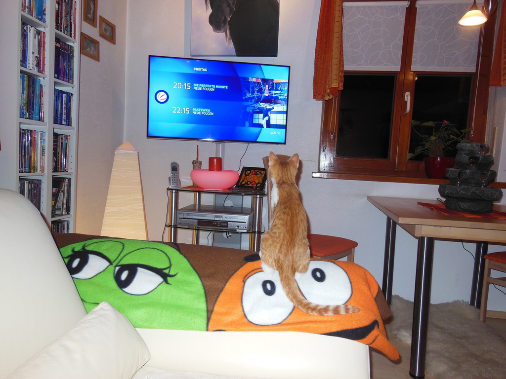 25.09.2014 - War ja klar, dass Tapsy Loui's Lieblingsplatz auf dem Wohnzimmerschrank irgendwann bemerken würde. Er musste sich zwar noch ziemlich anstrengen aber er hat es doch hinauf geschafft - siehe Pärchen- / Triofotos. Tapsy setzt immer noch "breiige Häufchen" ab. Ich werde den nächsten Tierklinikbesuch bis nach der anstehenden 2. Panacur- und der weiteren Tablettengabe anstellen. Sollte sich dann die Konsistenz von Tapsy's Kot nicht bedeutend verbessert haben, werden wir wohl nochmal in die Tierklinik fahren müssen.