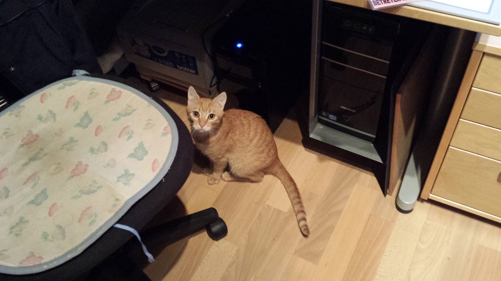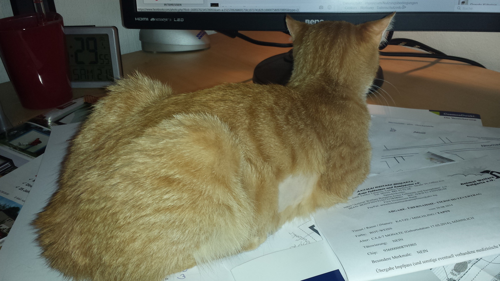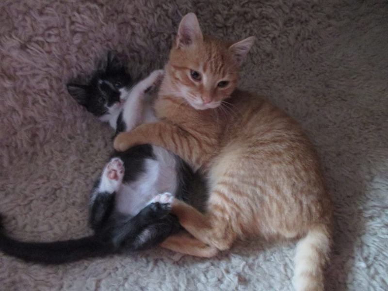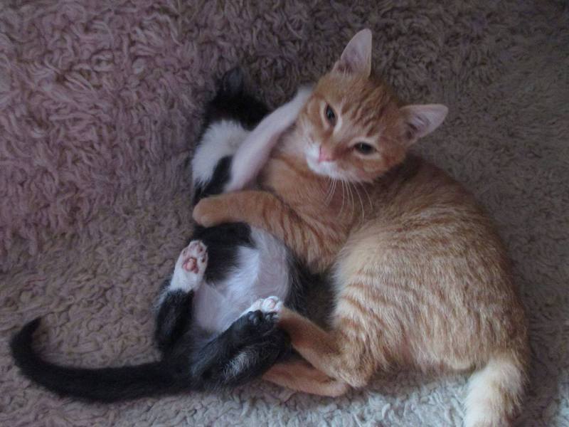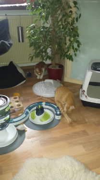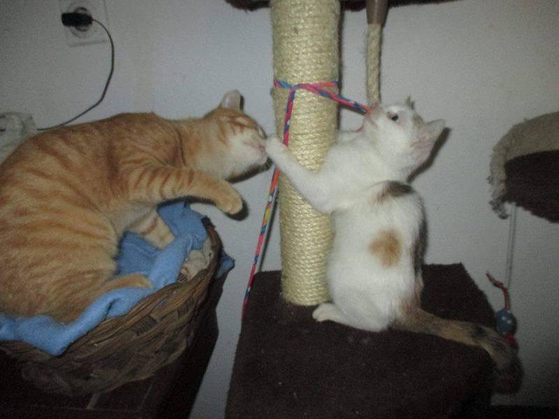 Die Zusammenführung mit Tapsy läuft super. Nach kurzer Zeit habe ich ihn herein gelassen. Beide schleichen vorsichtig umeinander, haben sich aber auch schon beschnüffelt und zeigen beide keinerlei Anzeichen von Aggression.