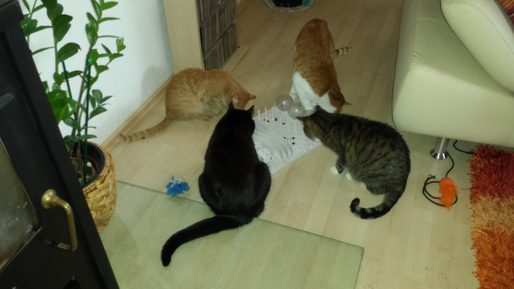 28.03.2016 - Dino nimmt wieder aktiv zusammen mit seinen 2 Kumpels und Gina am rituellen "fummeln" teil. Ich habe ihn danach gewogen: 2,89 kg (in der Tierklinik noch 3,06 kg - nach Wirkung der Entwässerung am Abend 2,86 kg). Das deutet hoffentlich darauf hin, dass sich keine neuen Wassereinlagerungen gebildet haben. Er schläft nicht mehr soviel wie die Tage zuvor und zeigt auch wieder Interesse für's spielen. Ich kann keine Berührungsempfindlichkeit mehr feststellen - weder am Ober- noch am Unterbauch. Die Nase ist kühl und feucht - was hoffentlich Fieber ausschließen lässt (richtige Fiebermessung unmöglich allein). Die Atmung ist im Normbereich.