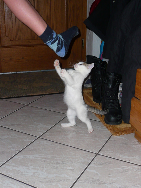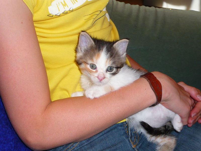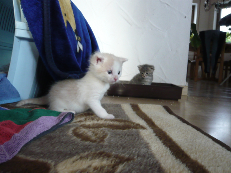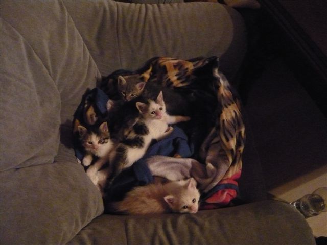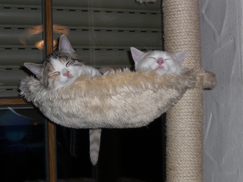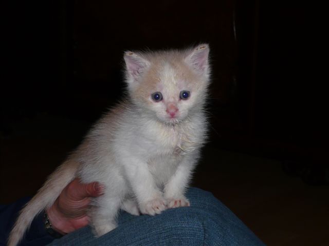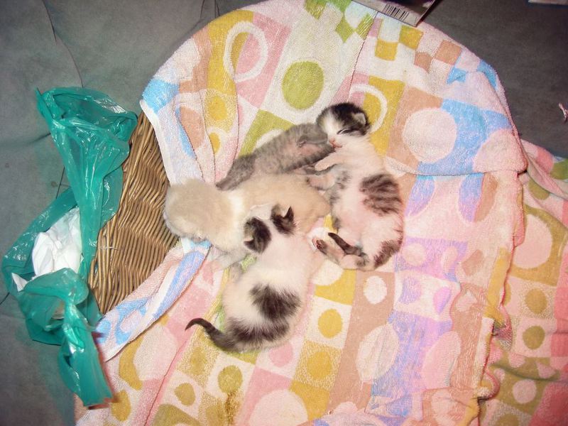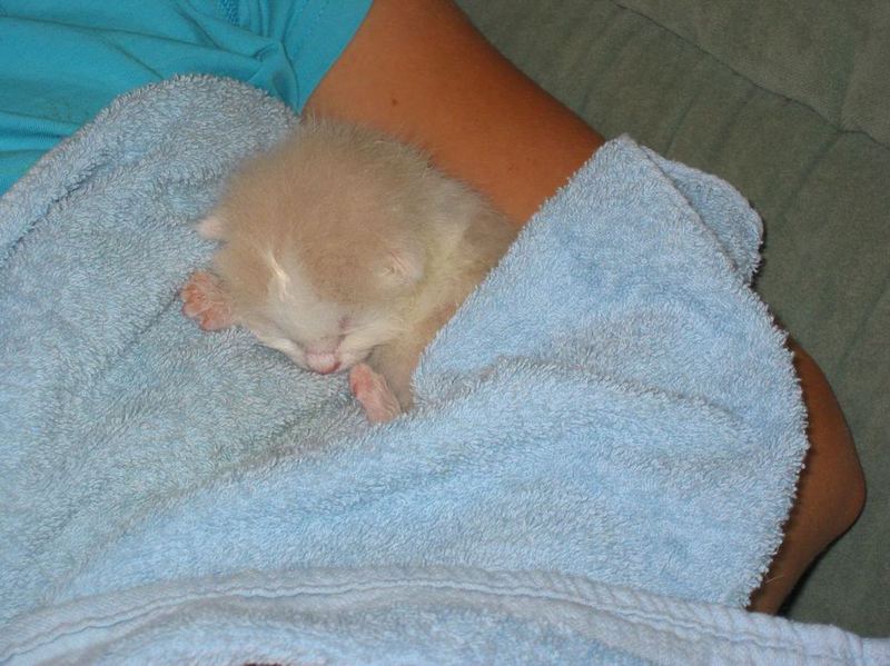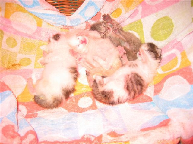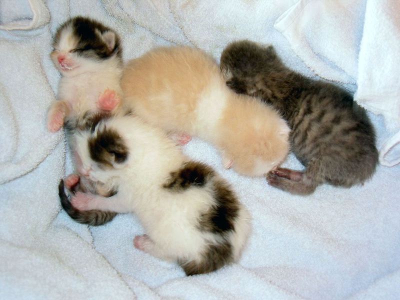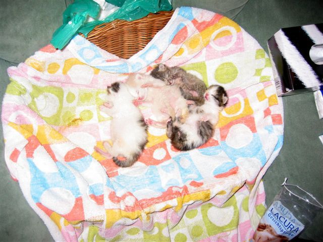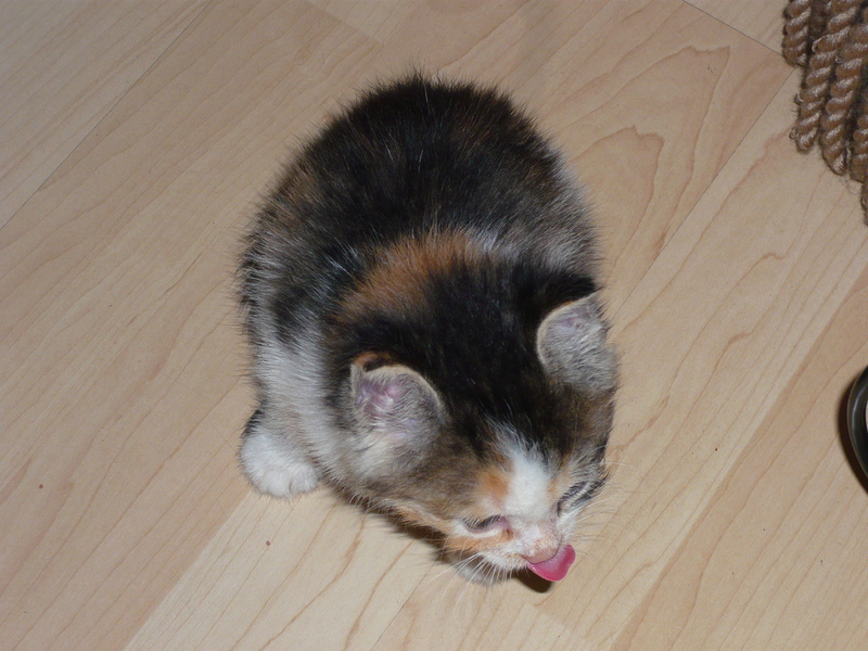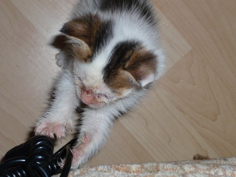 Übrigens waren die kleinen Kätzchen nie krank. Wenn sie auf den Fotos "verklebt" aussehen kommt das davon, dass bei den Milchfütterungen nicht immer alles wirklich in den Mäulchen landete weil die Racker mit vollem Körpereinsatz mitgeholfen haben. Das katzentypische "putzen" prägte sich erst in späterer Zeit wirklich aus. Und unsere Säuberungsversuche wurden nur sehr widerwillig geduldet. Auch als sie schon festes Futter zu sich nahmen fanden sich immer Spuren davon in den Gesichtern und anderen Körperteilen wieder. Sie haben damals gefressen wie kleine Schweinchen :-) .