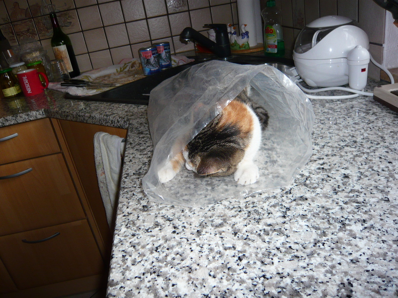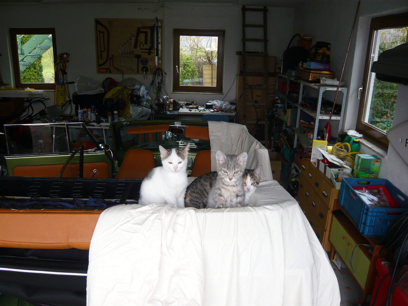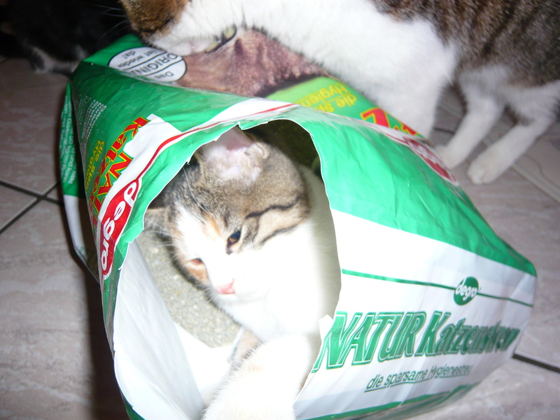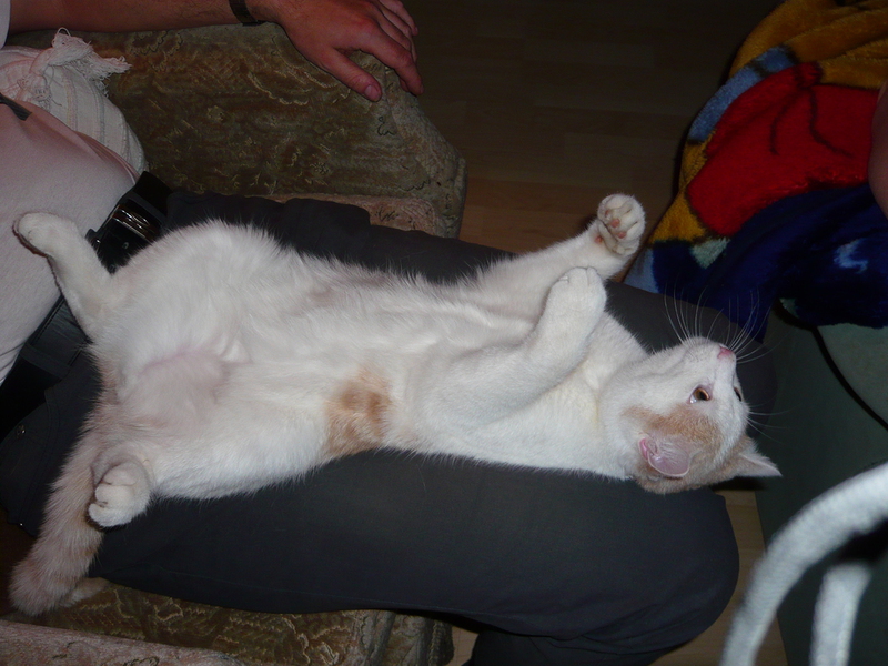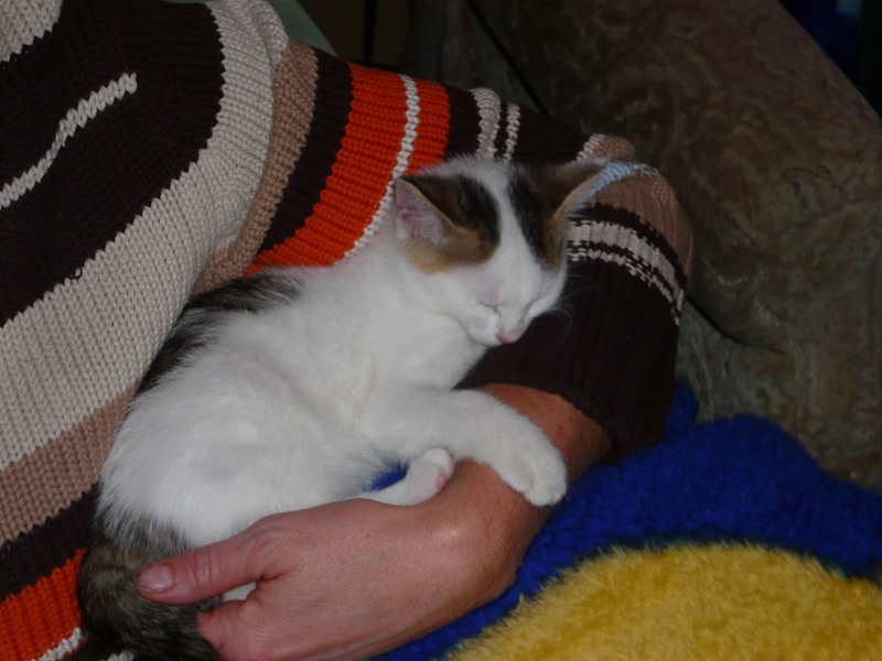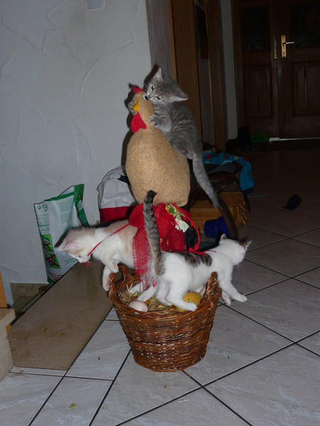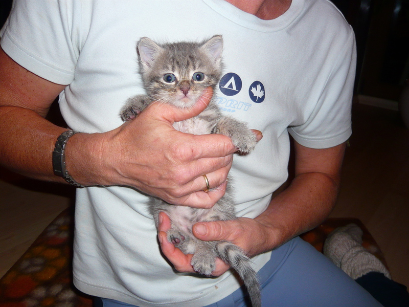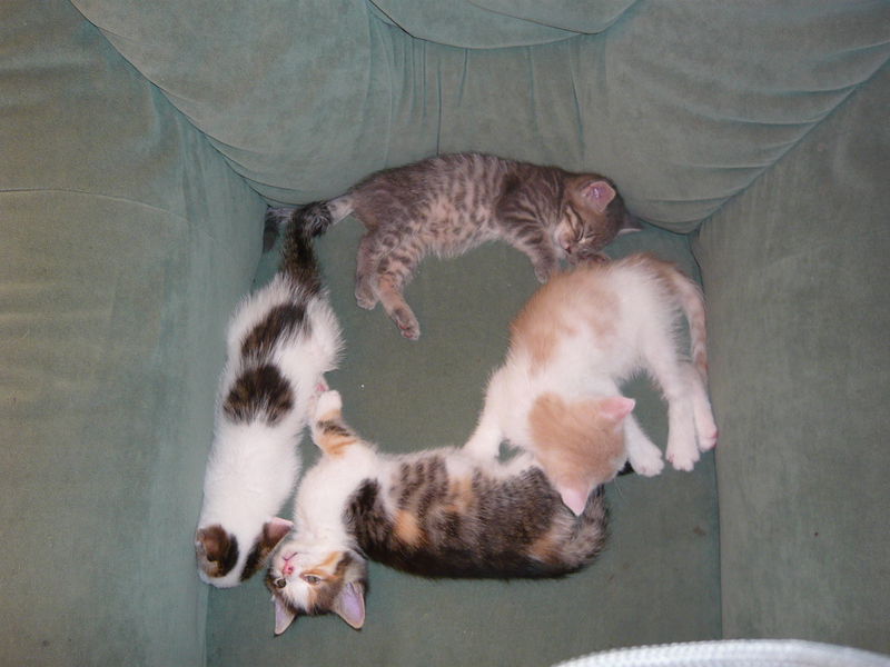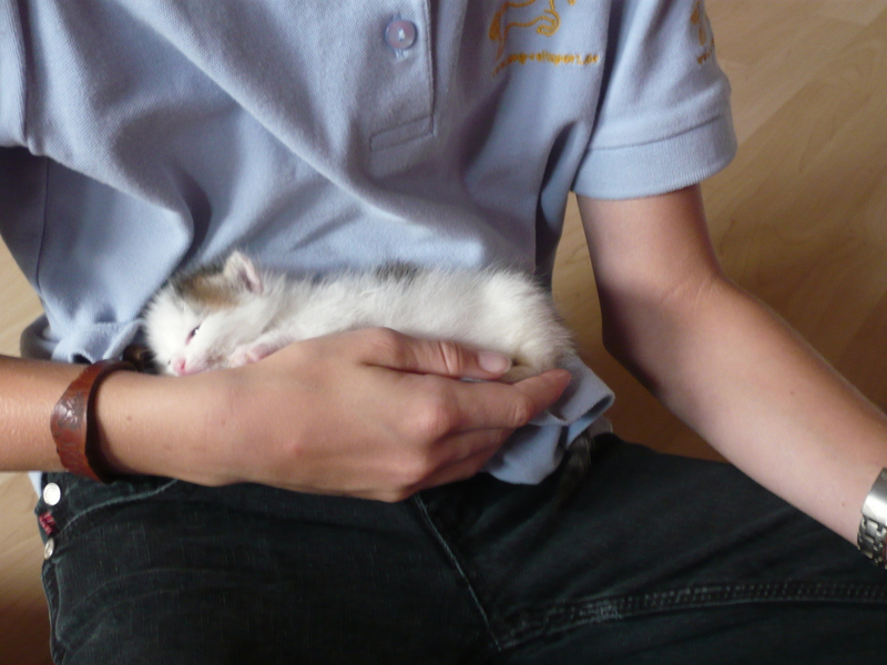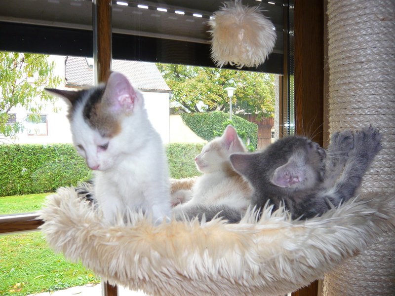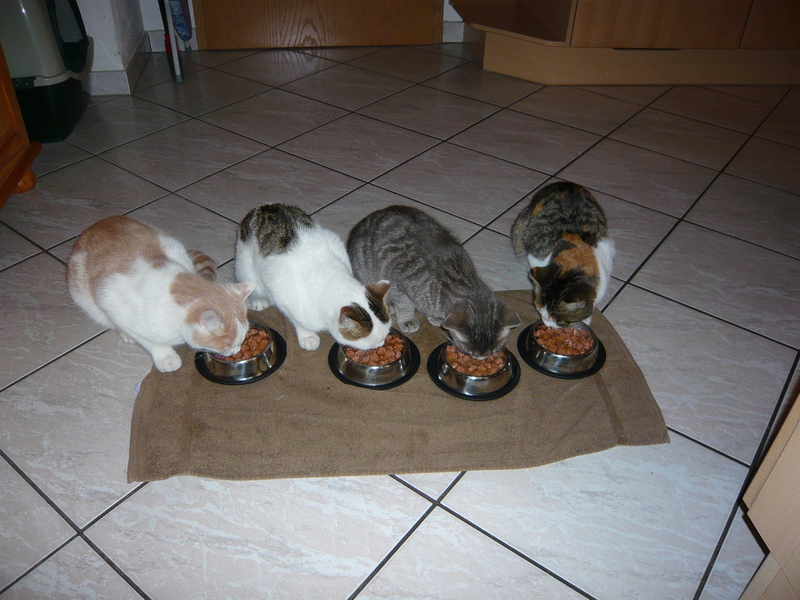 2009 - im Dorf der Familie von Emil wurde eine Katze, die bekannter Weise erst vor Kurzem einen Wurf hatte, überfahren auf der Straße gefunden. Die sofortige intensive Suche nach den Jungen war nach kurzer Zeit erfolgreich und die wenige Tage alten - noch blinden - Kätzchen wurden in letzter Sekunde gerettet, liebevoll versorgt und aufgezogen. Ich selbst durfte bei der Aufzucht aktiv unterstützen was mir große Freude bereitet hat. Bommel (graugestreift), Milky (weiß mit Flecken), Minzchen (dreifarbig) - wurde nach ihrer Mutter Minzi benannt - und Teddy (rotweiß) wurden groß und stark - natürlich auch kastriert. Anfangs wurde in Erwägung gezogen sie in gute Hände zu vermitteln. Aber selbstverständlich wollte sie dann doch niemand in der Familie mehr missen. Die graue Bommel suchte sich nach einiger Zeit selbst einen neuen Wohnsitz im Dorf bei einer Familie, deren grauer Kater vor kurzer Zeit verstorben war (als hätte sie es gewusst) und sie füllt dort eine große Lücke wieder aus.
