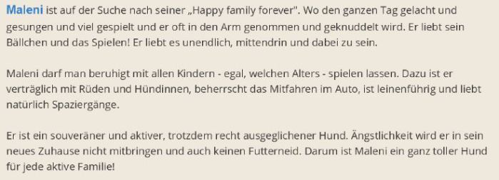 Maleni wird von der Lesika Hundehilfe vermittelt und als "Traumhund für aktive Familien" beschrieben.