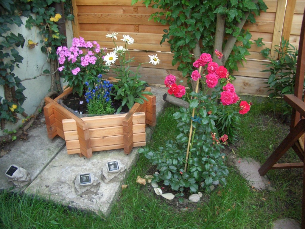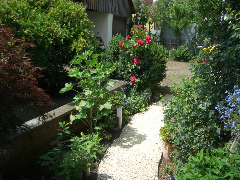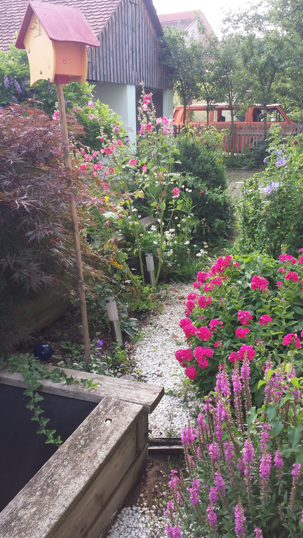 Unser Garten ist ein hübscher bunter Fleck Erde mit vielen Blumen und Düften, mit kleinen Tieren und einem Teich. Besonders eindrucksvoll erscheint mir unser Garten immer dann wenn es wärmer wird, die Pflanzen sprießen, die Blumen ihren Duft verbreiten und die Beeren anfangen reif zu werden. Dann genieße ich jede freie Minute, die ich in diesem wunderschönen Garten verbringen kann.