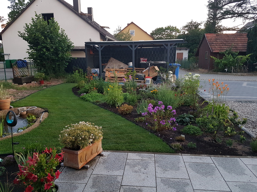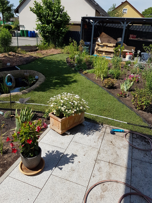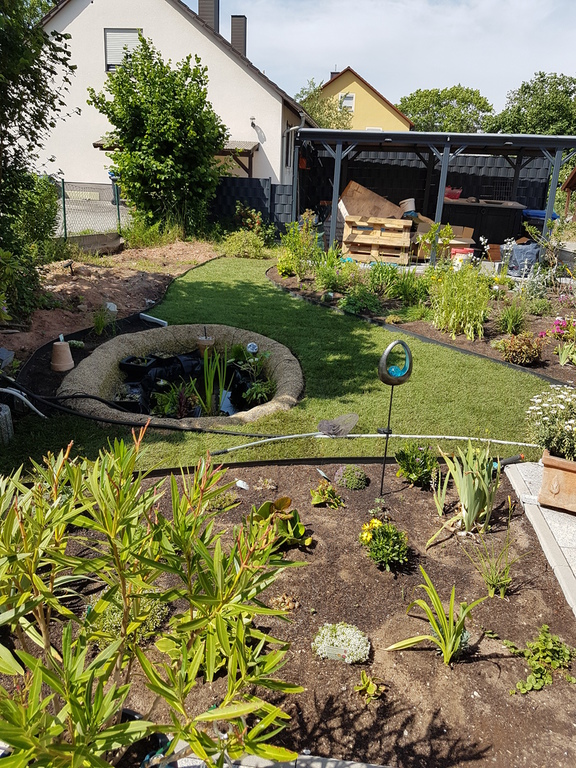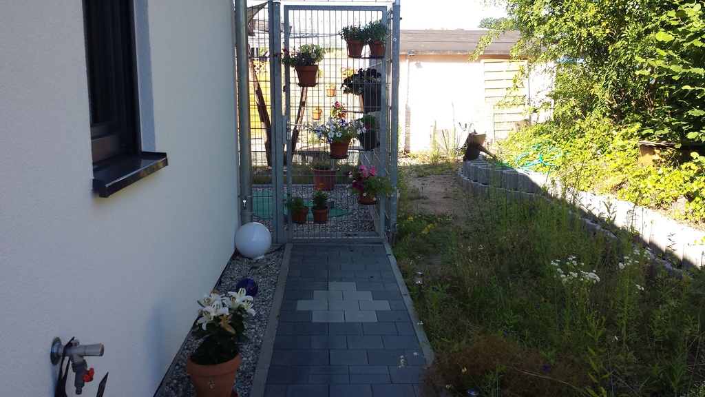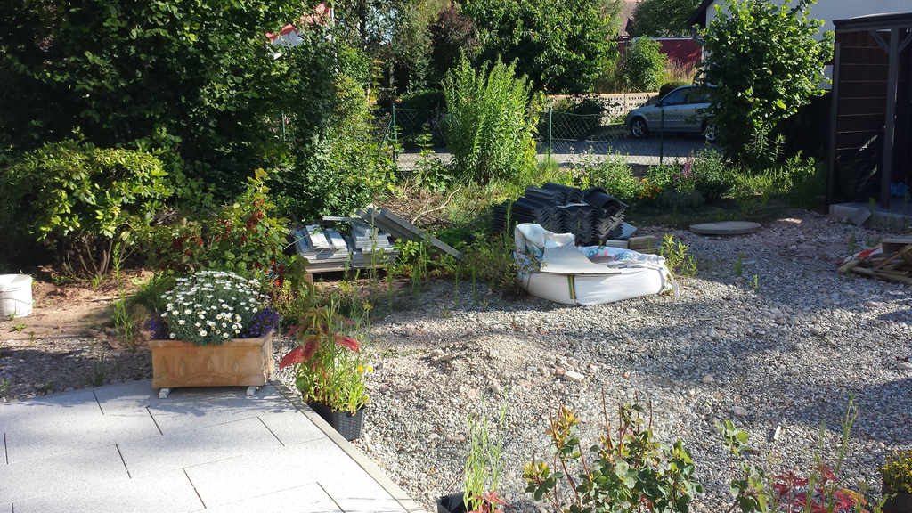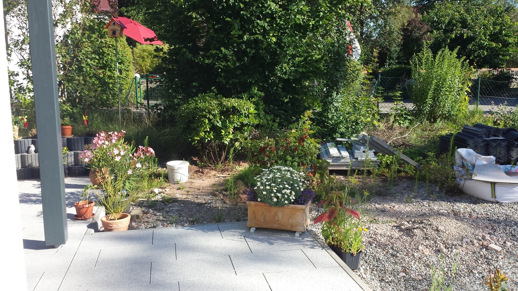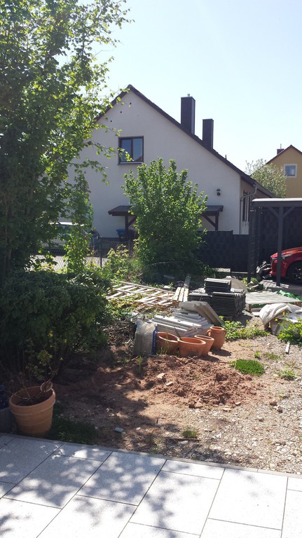 Ursprünglich wurde meine Wohnung in Roth im Hochparterre eines Zweifamilienhauses ohne Gartennutzung vermietet. 2009 sagte ich dann meinem Vermieter, dass ich mich nach einem neuen Wohnsitz umschaue weil ich keine Möglichkeit habe, mich am Feierabend, Wochenende oder im Urlaub gemütlich zum relaxen nach draußen zu begeben. Daraufhin kam sofort das Angebot das große Fischbecken hinter dem Haus mit Brettern zu decken um daraus eine große Terrasse entstehen zu lassen. Außerdem könnte ich den kleinen "Dschungel" zwischen Gartenzaun und der Terrasse "roden" und herrichten. Dieses Angebot habe ich natürlich mit Freuden angenommen, da meine Miezen und ich uns in dieser Wohnung sehr wohlfühlen und ich einem Umzug eigentlich mit Widerwillen entgegen gesehen hätte.
