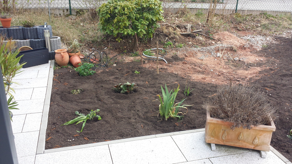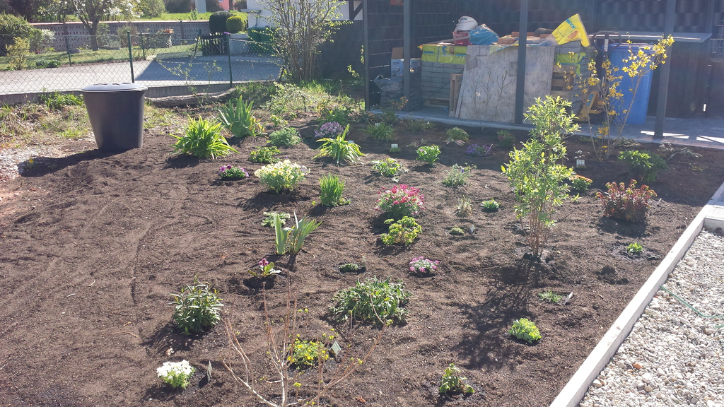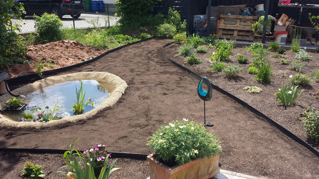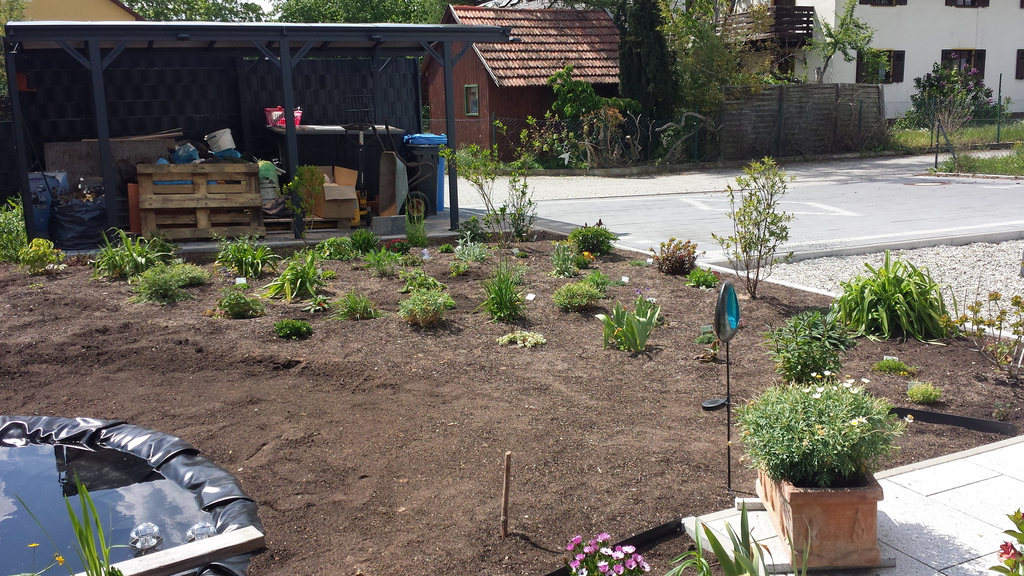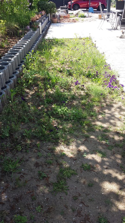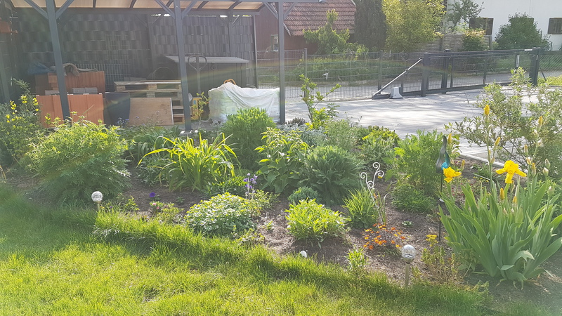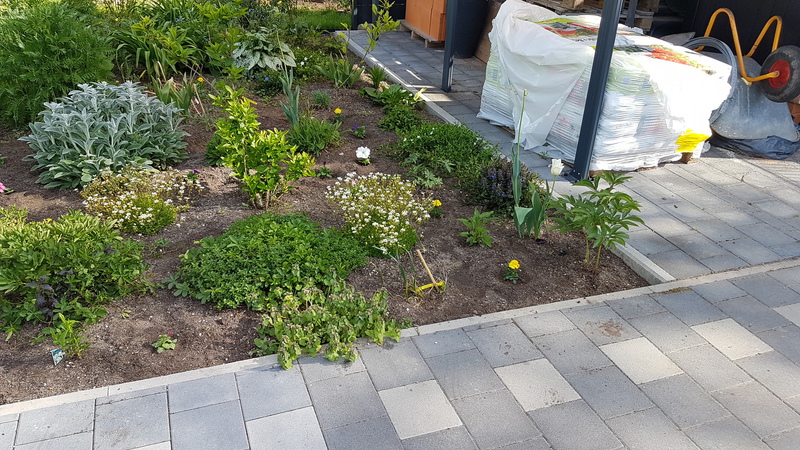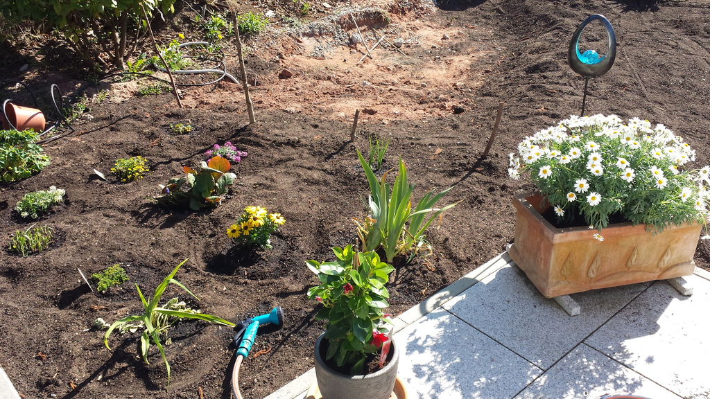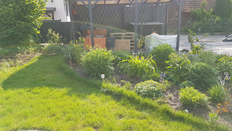 Das erste Blumenbeet ist fertig - Schmetterlinge und Bienen werden sich freuen (vorher / nachher).