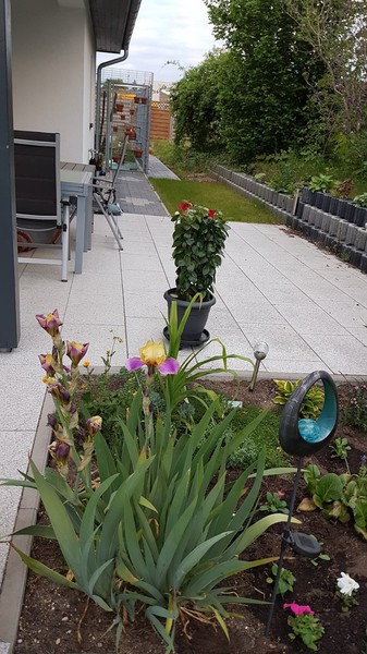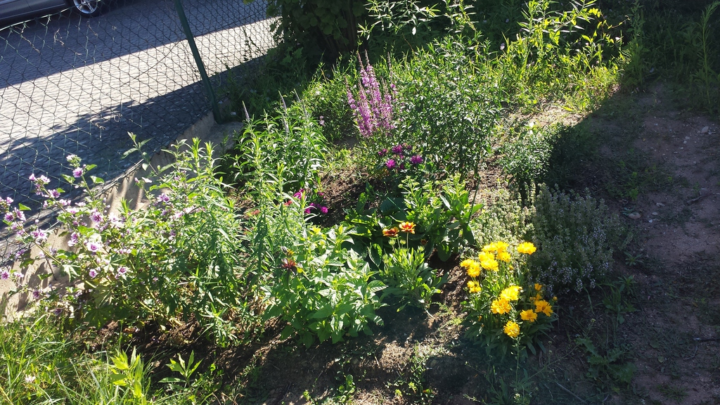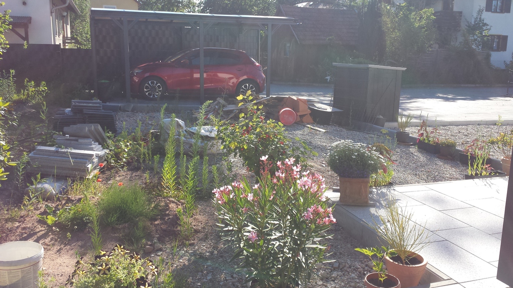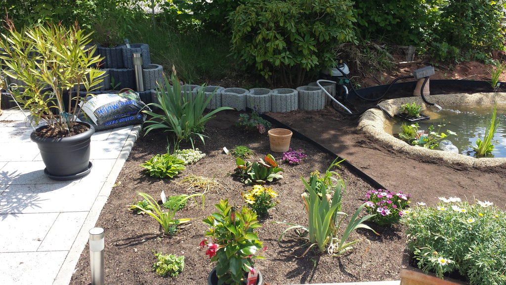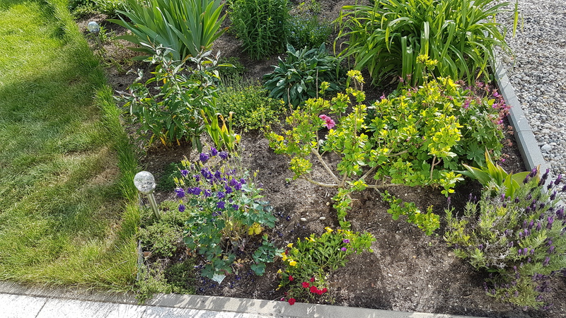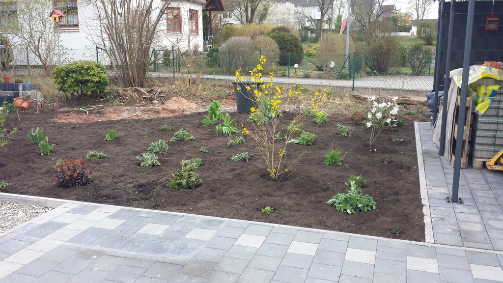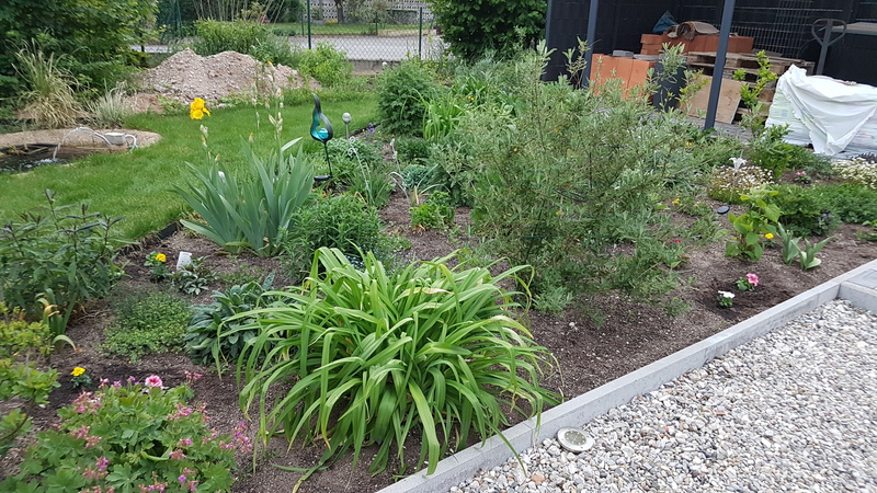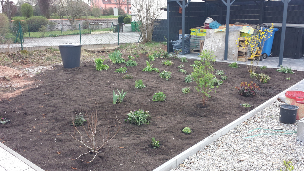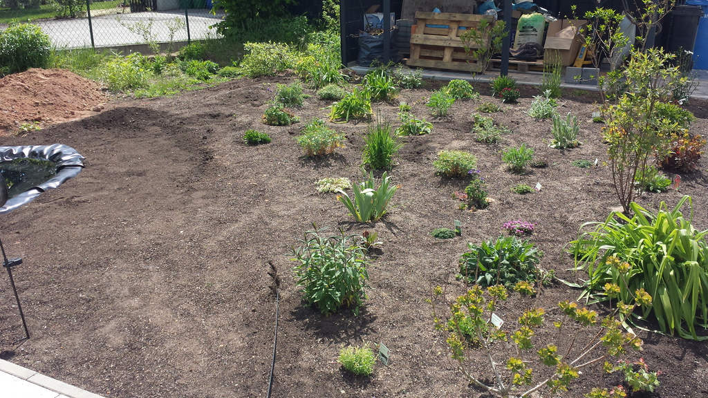 Das erste Blumenbeet ist fertig - Schmetterlinge und Bienen werden sich freuen (vorher / nachher).
